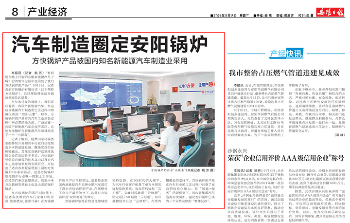 在方快鍋爐的客戶回訪簿上,記者多次看到汽車行業(yè)客戶的評語:性能穩(wěn)定,皮實(shí)可靠!在方快鍋爐的生產(chǎn)訂單排期上,記者檢索到國內(nèi)新能源汽車品牌“小鵬”汽車增訂了兩臺方快鍋爐的產(chǎn)品,在規(guī)模化工業(yè)生產(chǎn)盛行的當(dāng)下,這是對方快鍋爐及“安陽制造”的肯定。