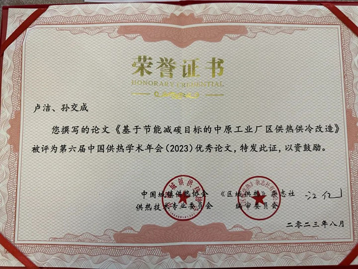 經(jīng)過中國工程院院士江億教授和30位供熱行業(yè)專家的嚴(yán)格審核和精心評價(jià),我司研發(fā)經(jīng)理盧潔撰寫的論文《基于節(jié)能減碳目標(biāo)的中原工業(yè)廠區(qū)供熱供冷改造》最終被評為“第六屆中國供熱學(xué)術(shù)年會(2023)優(yōu)秀論文”,同時入選《中國供熱學(xué)術(shù)年會論文(2023)》電子版U盤。